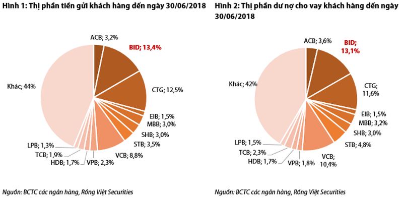 Ngoài BIDV, các ngân hàng có gốc quốc doanh như Vietinbank (CTG), Vietcombank (VCB) cũng nắm giữ thị phần lớn đối với mảng cho vay và huy động tính đến ngày 30/6/2018.