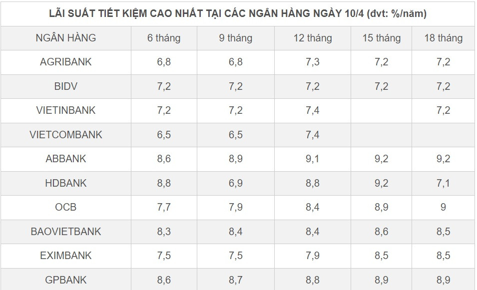 Theo đó, lãi suất tiết kiệm các kỳ hạn từ 1-5 tháng vẫn được Techcombank duy trì mức lãi suất trần 5,5%/năm theo quy định của NHNN kể từ ngày 3/4.