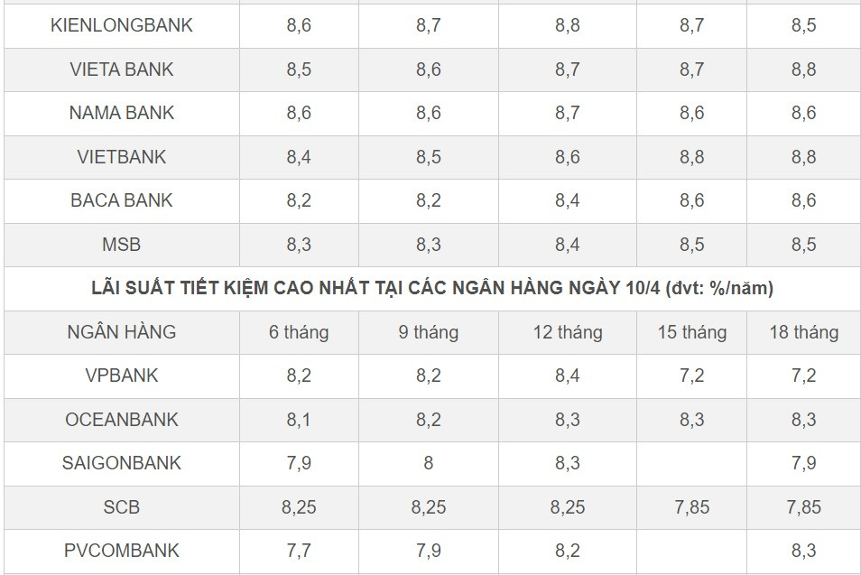 Trong khi đó, PVCombank giảm 0,5% lãi suất các kỳ hạn trên 5 tháng. Kỳ hạn 6 tháng hiện có lãi suất 7,7%/năm, kỳ hạn 9 tháng còn 7,9%/năm, kỳ hạn 12 tháng là 8,2%/năm, kỳ hạn 18 tháng trở lên là 8,3%/năm.