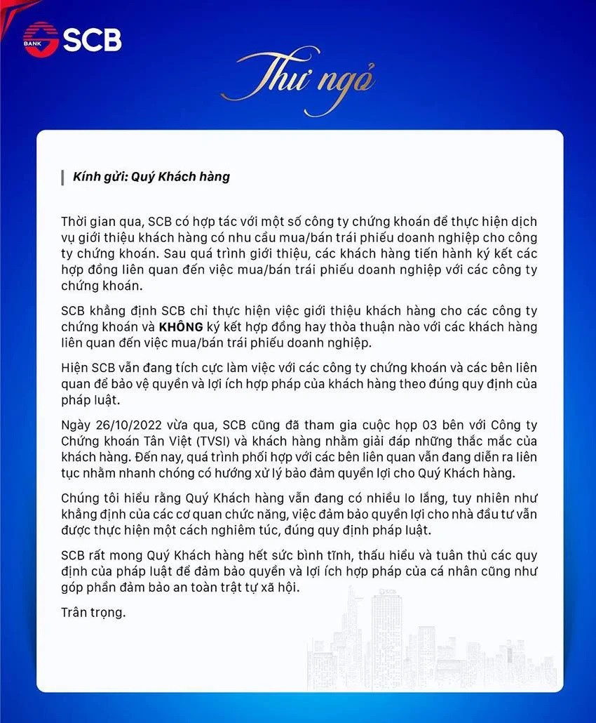 “Chúng tôi hiểu rằng quý khách hàng vẫn đang có nhiều lo lắng, tuy nhiên như khẳng định của các cơ quan chức năng, việc bảo đảm quyền lợi cho nhà đầu tư vẫn được thực hiện một cách nghiêm túc, đúng quy định của pháp luật. SCB rất mong quý khách hàng hết sức bình tĩnh, thấu hiểu và tuân thủ các quy định của pháp luật để đảm bảo quyền và lợi ích hợp pháp của cá nhân cũng như góp phần bảo đảm an toàn trật tự xã hội”, trích thư ngỏ của SCB.