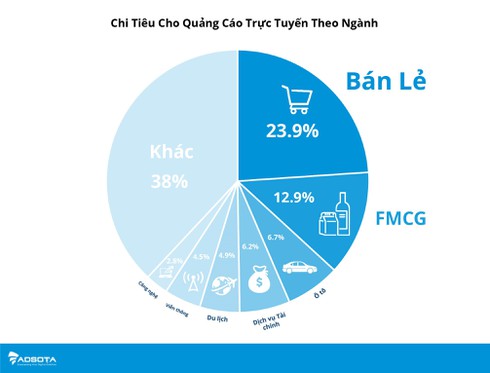 Trong năm 2019, các nhãn hàng thuộc các nhóm ngành là bán lẻ/thương mại điện tử và tiêu dùng nhanh (FMCG) là các đơn vị chi nhiều ngân sách Marketing nhất cho quảng cáo digital với lần lượt 23,9% và 12,9% tổng ngân sách quảng cáo trực tuyến.