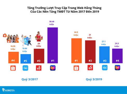 Năm 2019, thương mại điện tử Việt Nam đạt tổng giá trị 38 tỷ USD. Xét về số lượt truy cập trong năm vừa qua, Lazada đang tỏ ra hụt hơi khi bị Shopee và Tiki vượt lên kể từ cuối năm 2018 và bị Sendo vượt qua trong 2 quý gần đây.