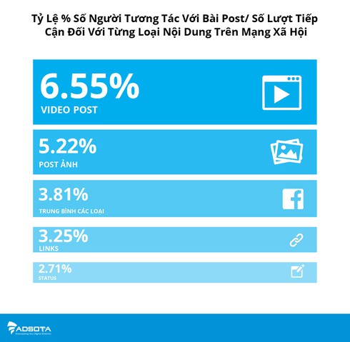 Video là dạng nội dung đạt nhiều tương tác nhất trên Facebook ở Việt Nam với tỷ lệ 6,55% trên tổng số lượt tiếp cận. Điều này có thể hiểu là khi một post trên Facebook dưới dạng video tiếp cận đến 100 người dùng, sẽ có hơn 6 người trong số đó tương tác (comment, react, share).