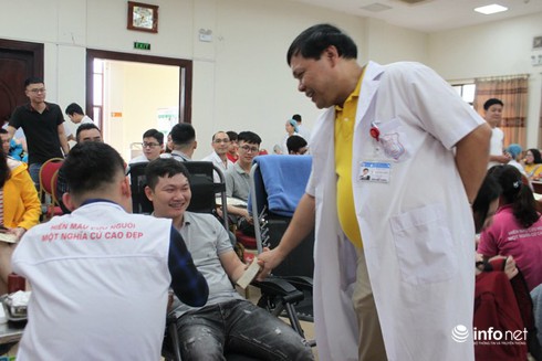 Vừa động viên người hiến máu, GĐ Trần Danh Cường cũng chia sẻ, trong số những cán bộ nhân viên bệnh viện hiến máu hôm nay, có gần 50 cán bộ đã hiến máu tình nguyện trên 5 lần liên tục. Thậm chí, có nhiều thầy thuốc đã hiến máu trên 10 lần. Đặc biệt có nhân viên y tế hiến máu đến 25 lần.