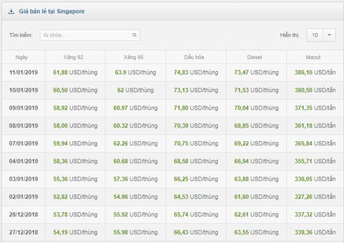 Bảng cập nhật giá xăng dầu trên thị trường Singapore từ Bộ Công Thương. |