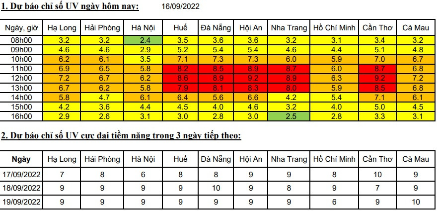 Dự báo về chỉ số tia UV cực đại, Trung tâm khí tượng thủy văn Quốc gia nhận định, trong ngày hôm nay (16/9), các thành phố ở Bắc Bộ, TP.HCM và Cà Mau ở mức cao (trong khoảng 2,9 - 7,2), còn các thành phố miền Trung và Cà Mau đạt mức rất cao (cao nhất là Hội An, chỉ số UV cực đại đạt ngưỡng 9,2 vào lúc 12h trưa).