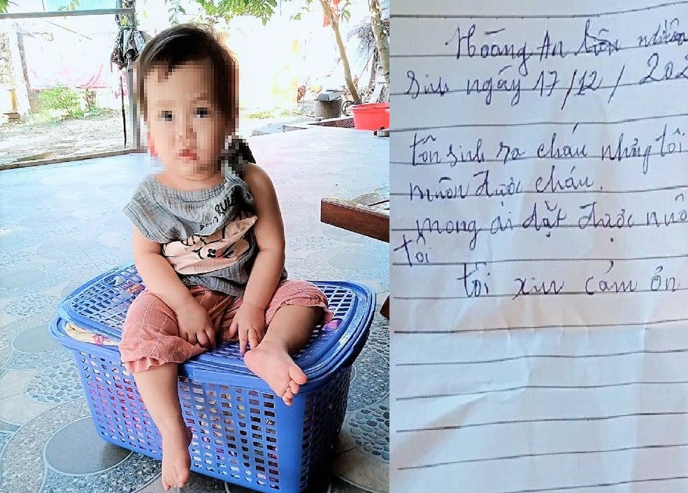 Trong giỏ màu xanh có một mảnh giấy ghi: "Hoàng An Nh., sinh ngày 17/12/2021. Tôi sinh ra cháu nhưng tôi không nuôi được cháu. Mong ai nhặt được nuôi cháu dùm tôi. Tôi xin cảm ơn".