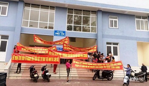 Cư dân căng băng rôn, phản đối các chính sách chưa hợp lý ở chung cư PVNC2-CT02. |