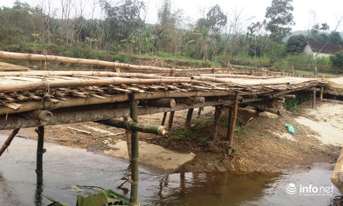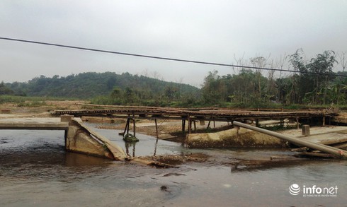 Cầu đã bị gãy trôi mất gần 1 nửa và người dân trong xóm Đồng Lụm, xã Châu Quang phải tự đóng góp làm cầu tre tạm để đi qua. |