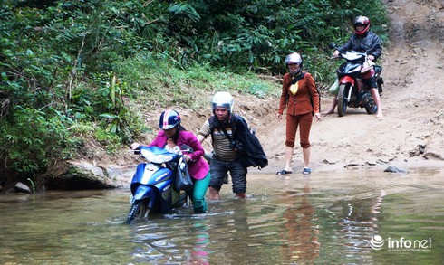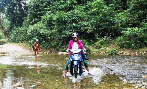 Để đến được điểm trường Khe Nóng, các cô giáo phải vượt qua hàng chục km đường rừng, nhiều con suối. |