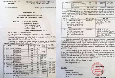 Đơn trình báo của Công ty CP Chanh leo Nafoods gửi các cơ quan chức năng. |