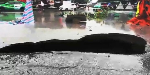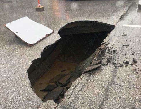 "Hố tử thần" bất ngờ xuất hiện trên mặt đường Lê Viết Thuật sau trận mưa lớn. |