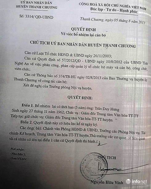 Quyết định bổ nhiệm ông Trần Duy Hưng tiếp tục giữ chức Giám đốc Trung tâm VHTTTT Thanh Chương. |