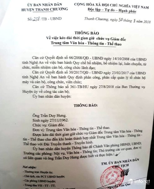 Theo tìm hiểu của PV Infonet, ông Trần Duy Hưng – Giám đốc Trung tâm VHTTTT huyện Thanh Chương đã hết hai nhiệm kỳ giữ chức vụ lãnh đạo từ ngày 5/8/2018. Từ đó đến nay, ông Hưng đã được Chủ tịch UBND huyện Thanh Chương ký thông báo 238/TB-UBND ngày 30/8/2018 kéo dài thời gian công tác cho đến khi hợp nhất xong Trung tâm VHTTTT và Đài Truyền thanh truyền hình huyện thành Trung tâm Văn hóa, Thể thao và Truyền thông.