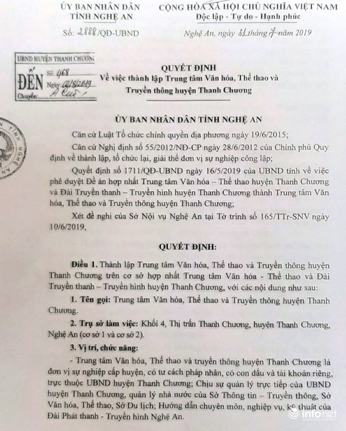 Quyết định thành lập Trung tâm Văn hóa - Thể thao và Truyền thông huyện Thanh Chương. |
