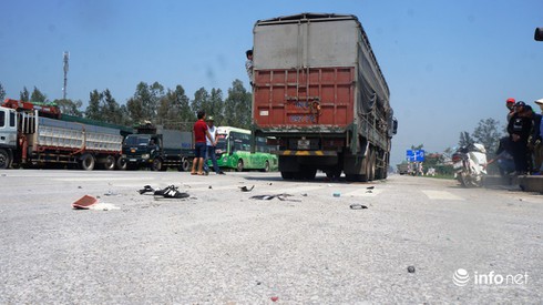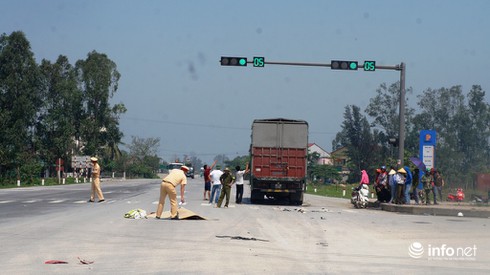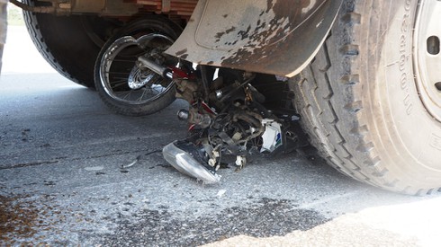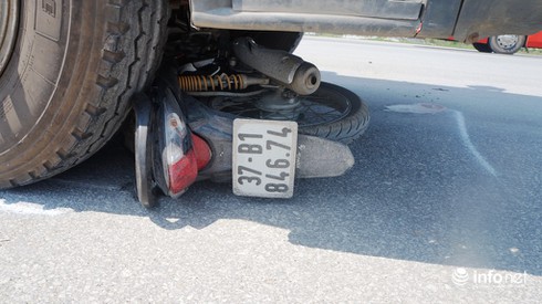Ghi nhận của PV tại hiện trường, chiếc xe máy bị kéo lê khoảng hơn 20m, nằm lọt dưới gầm xe tải, biến dạng hoàn toàn, nhiều mảnh vỡ bay tung tóe trên mặt đường. Sau khi xảy ra tai nạn, tài xế chiếc xe tải đã rời khỏi hiện trường.