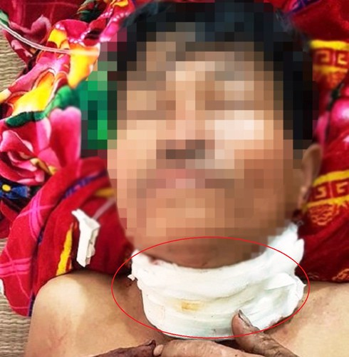 Ông Hùng bị lưỡi cưa cắt làm mất nhiều phần da, thịt ở vùng cổ, bị rách một nửa cơ tuyến giáp và lộ khí quản. |