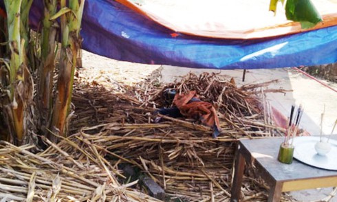 Tại hiện trường, nạn nhân Huội và chiếc xe máy được phủ một tấm bạt và cây ngô ở phía trên.