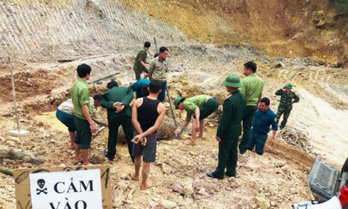 Trong lúc san ủi, khi máy múc múc xuống lòng đất khoảng mấy mét thì mọi người hoảng hồn phát hiện một quả bom khủng.