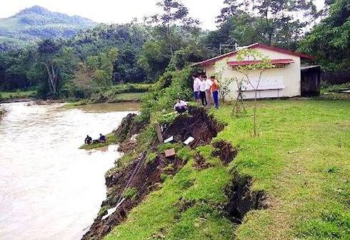 Bờ suối Nậm Căn bị sạt lở nghiêm trọng, đe dọa đến trường Tiểu học Châu Hoàn. |