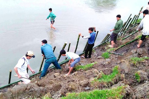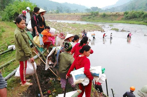 Hàng trăm phụ huynh và học sinh cùng thầy, cô giáo trường Châu Hoàn làm bờ kè, gia cố. |