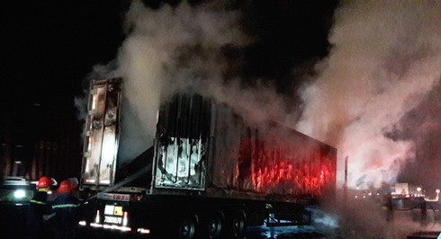 Sau tiếng nổ lớn, chiếc xe Container bất ngờ bốc cháy dữ dội. |