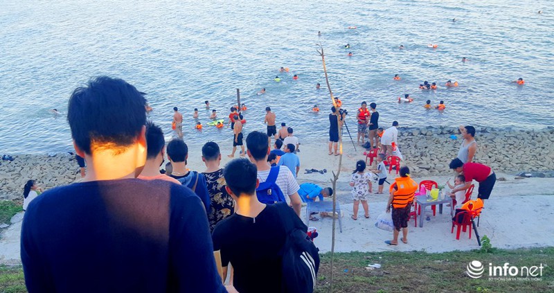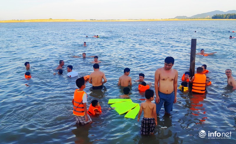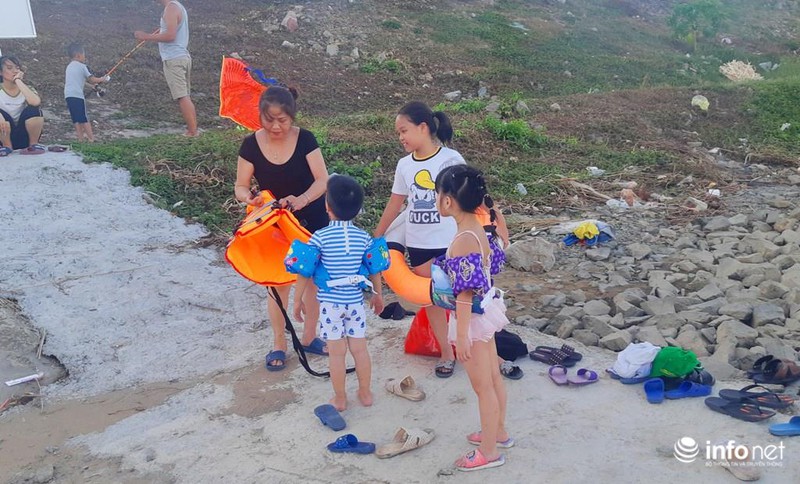 Theo quan sát của PV Infonet, hầu hết người đến tắm đều trang bị áo pháo, nhưng cũng có không ít người dân sử dụng can nhựa, hộp xốp tự chế hoặc không trang bị thiết bị hỗ trợ.