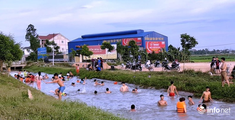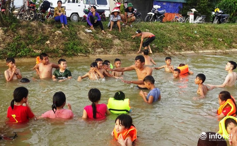 Cứ khoảng 17h chiều hàng ngày, hàng trăm trẻ đổ xô ra đoạn kênh mương tập bơi dưới sự hướng dẫn của các Bí thư chi đoàn thôn xóm.