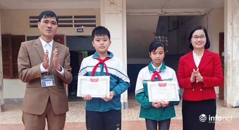 Đại diện Ban giám hiệu nhà trường tặng Giấy khen cho 2 em học sinh. |