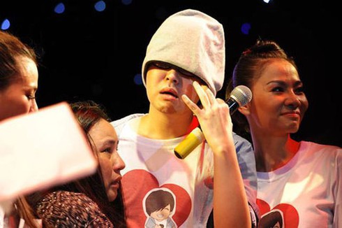 Wanbi Tuấn Anh trong vòng tay của các đồng nghiệp, người thân trên sân khấu một chương trình ca nhạc từ thiện quyên góp giúp anh có chi phí phẫu thuật.