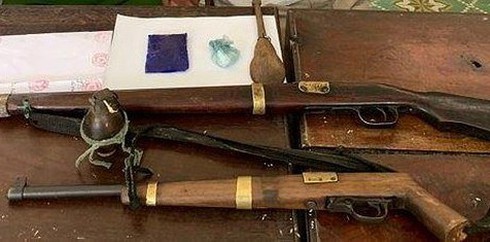 Kiển tra tại hiện trường, lực lượng chức năng thu giữ 300 viên ma túy tổng hợp, 25 gam heroin, 1 quả lựu đạn, 1 súng cacbin có đạn đã lên nòng, 1 khẩu súng kíp và 1 con dao nhọn.