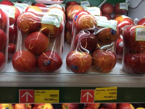 Tại siêu thị như Lotte Mart (229 Tây Sơn, Hà Nội), nhiều loại táo, cam nhập khẩu chỉ có giá bán 70.000 – 80.000 đồng/kg, riêng táo Envy chỉ có giá 60-103.000 đồng/kg, trong khi một số cửa hàng hoa quả nhập khẩu khác có nơi bán tới gần 300.000 đồng/kg.