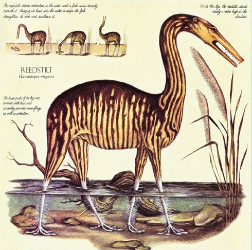 Khủng long Harundopes virgatus sống trên bờ, gần sống hồ để săn cá, thường xuất hiện ở lục địa phía Bắc. Cấu trúc thân thể độc đáo, có vú, có đốt sống cổ số 7.