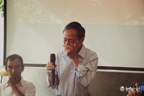 Thầy Nguyễn Thận- "Nhân vật của năm 2015" do độc giả Báo điện tử Infonet bình chọn xúc động phát biểu trong buổi lễ tôn vinh (Bên trái thầy là ông Huỳnh Văn Nén). |