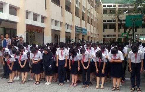Học sinh THCS Trần Phú cúi chào trước linh cữu thầy hiệu trưởng. Ảnh: Liên đội Trần Phú - Quận 10. |