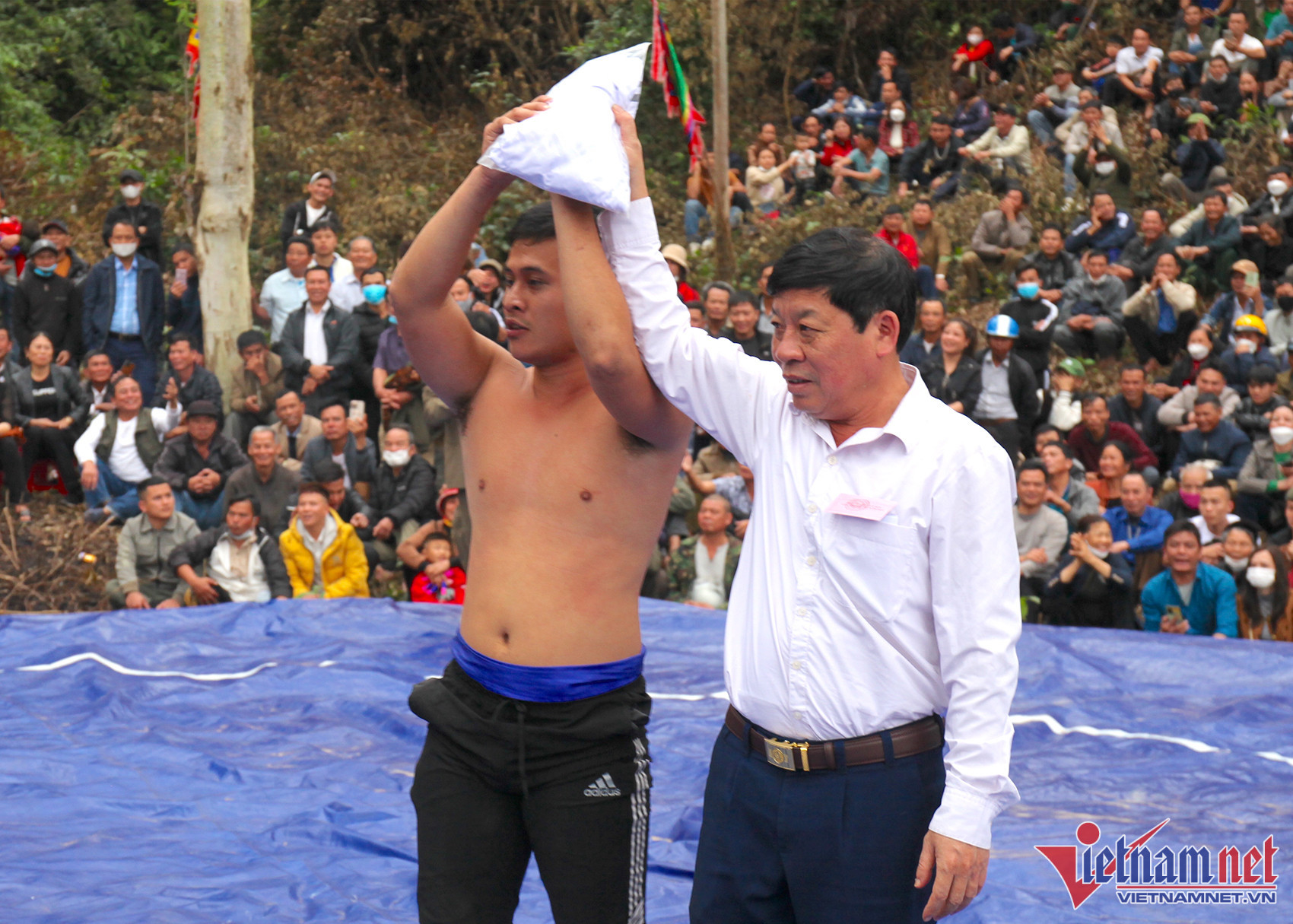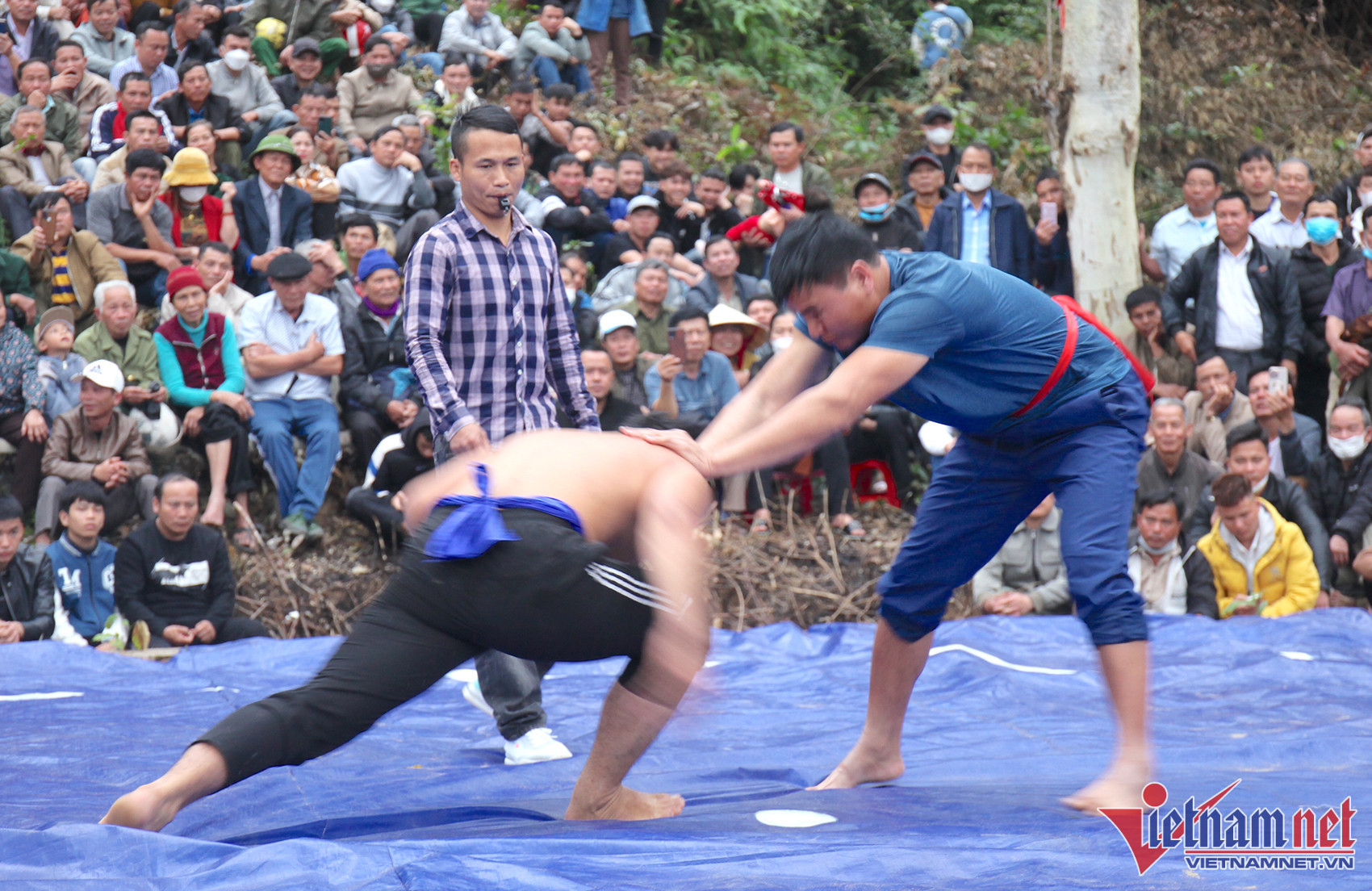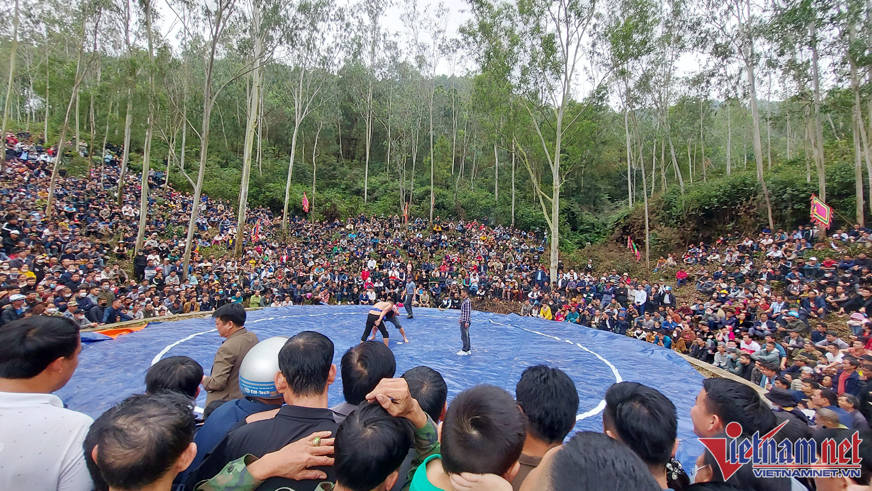 Nghìn người vây kín chân núi hò reo cổ vũ màn tranh tài trên sới vật