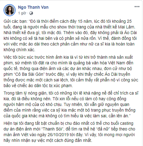 Bên cạnh đó, cô cũng thừa nhận rằng trong tâm lý nóng giận, bản thân đã có những lời lẽ khá nặng nề để chỉ trích ca sĩ kia, đó là điều không nên. "Tôi xin lỗi nếu có làm cô hay cộng đồng người hâm mộ của cô khó chịu. Tuy nhiên, tôi vẫn giữ nguyên quan điểm của mình rằng việc ca sỹ kia mặc một bộ trang phục truyền thống của quốc gia khác mà không có tìm hiểu là việc làm sai, cần lên án.” - Ngô Thanh Vân thẳng thắn chia sẻ.