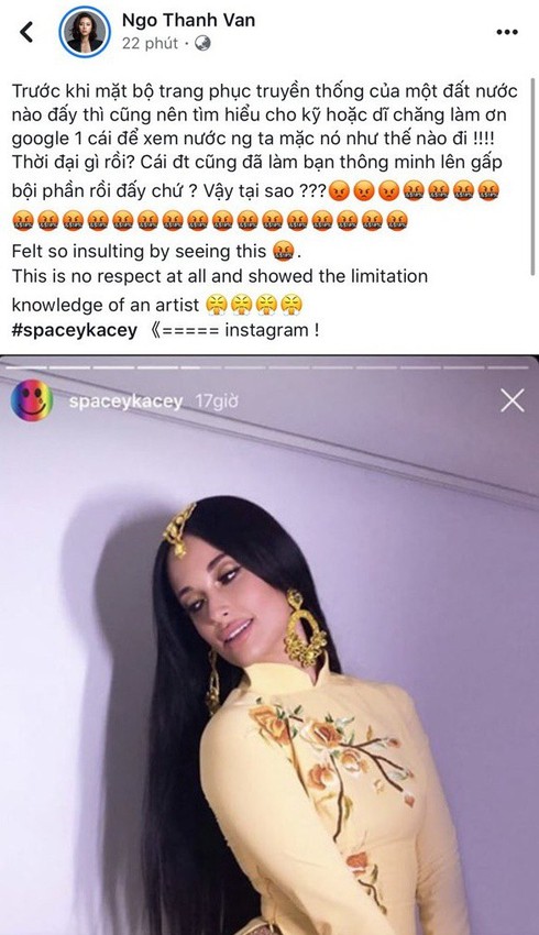 Vừa qua, sự việc nữ ca sĩ nhạc đồng quê Kacey Musgraves mặc áo dài nhưng lại không mặc quần khi biểu diễn đã gây ra làn sóng phẫn nộ dữ dội từ công chúng. Trong đó, Ngô Thanh Vân là sao Việt đầu tiên lên tiếng chỉ trích hành động và ý thức của nữ ca sĩ khi xúc phạm nặng nề tà áo dài Việt Nam.