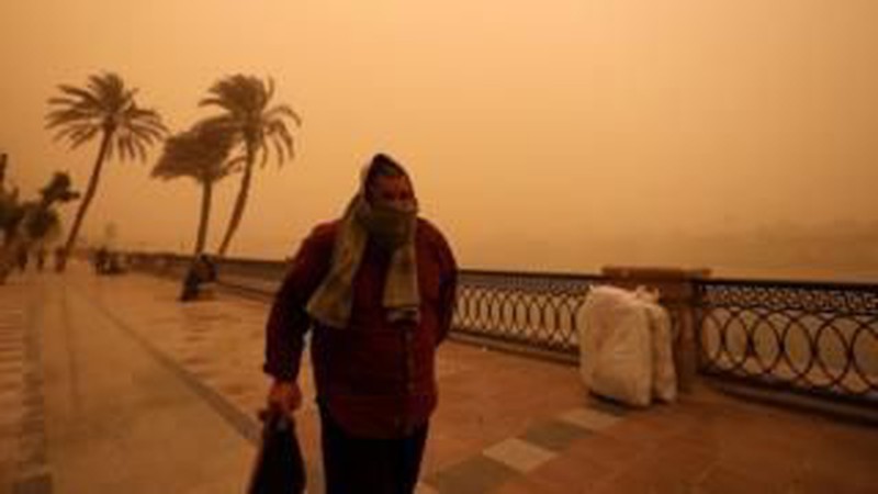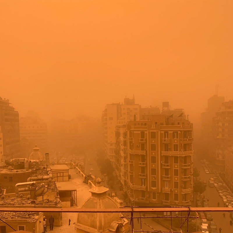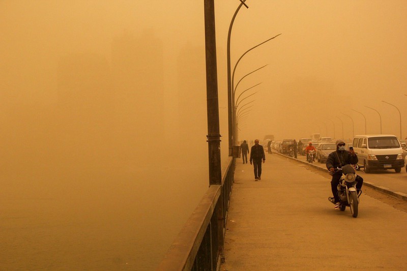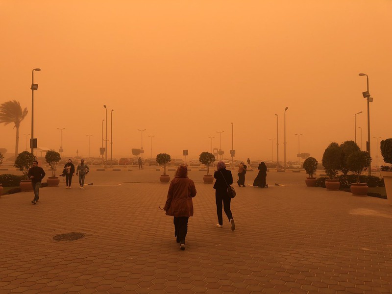 Nhiều người đi bộ phải trú vào các tòa nhà để tránh bụi khi một đám mây màu cam sẫm bao trùm Cairo. Nhiều người khác cũng phải đeo khẩu trang kín mít để tránh cát thổi mạnh do gió.