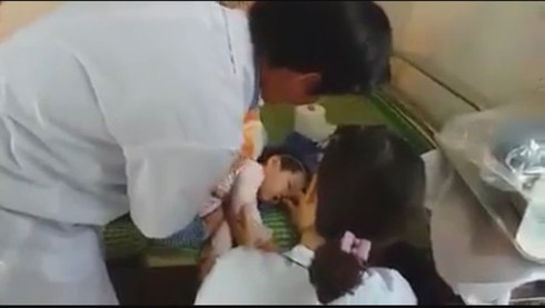 Ngay lập tức, bác sĩ Thu cùng các đồng nghiệp khẩn trương tiến hành cấp cứu. Cháu bé được đặt nằm xuống nền gạch để tiến hành ép tim, thổi ngạt.