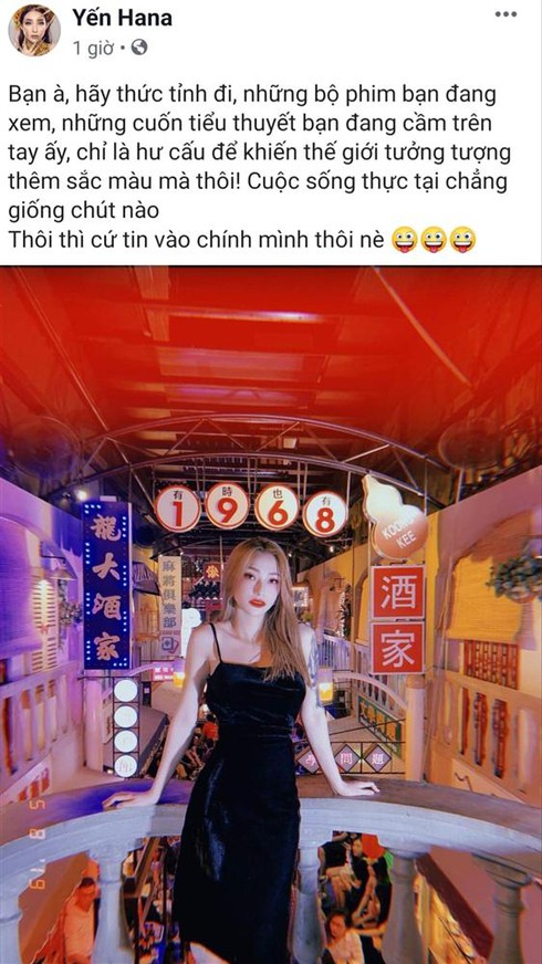 "Bạn à, hãy thức tỉnh đi, những bộ phim bạn đang xem, những cuốn tiểu thuyết bạn đang cầm trên tay ấy, chỉ là hư cấu để khiến thế giới tưởng tượng thêm sắc màu mà thôi! Cuộc sống thực tại chẳng giống chút nào. Thôi thì cứ tin vào chính mình thôi nè", Yến Hana - người yêu cũ của Kin Nguyễn viết. Cặp đôi từng yêu nhau thời gian khi Kin Nguyễn chưa phẫu thuật, sau đó thì cả 2 đường ai nấy đi. |