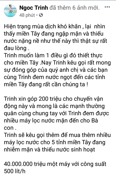 Ngọc Trinh chia sẻ: "Hiện trạng mùa dịch khó khăn, lại nhìn thấy miền Tây đang ngập mặn và thiếu nước nặng nề như thế này thì thật sự rất đau lòng. Trinh muốn làm 1 điều gì đó thiết thực cho miền Tây. Nay Trinh kêu gọi rất mong sự đóng góp của quý anh chị và các bạn cùng Trinh đem nước ngọt đến các tỉnh miền Tây đang rất cần chúng ta!