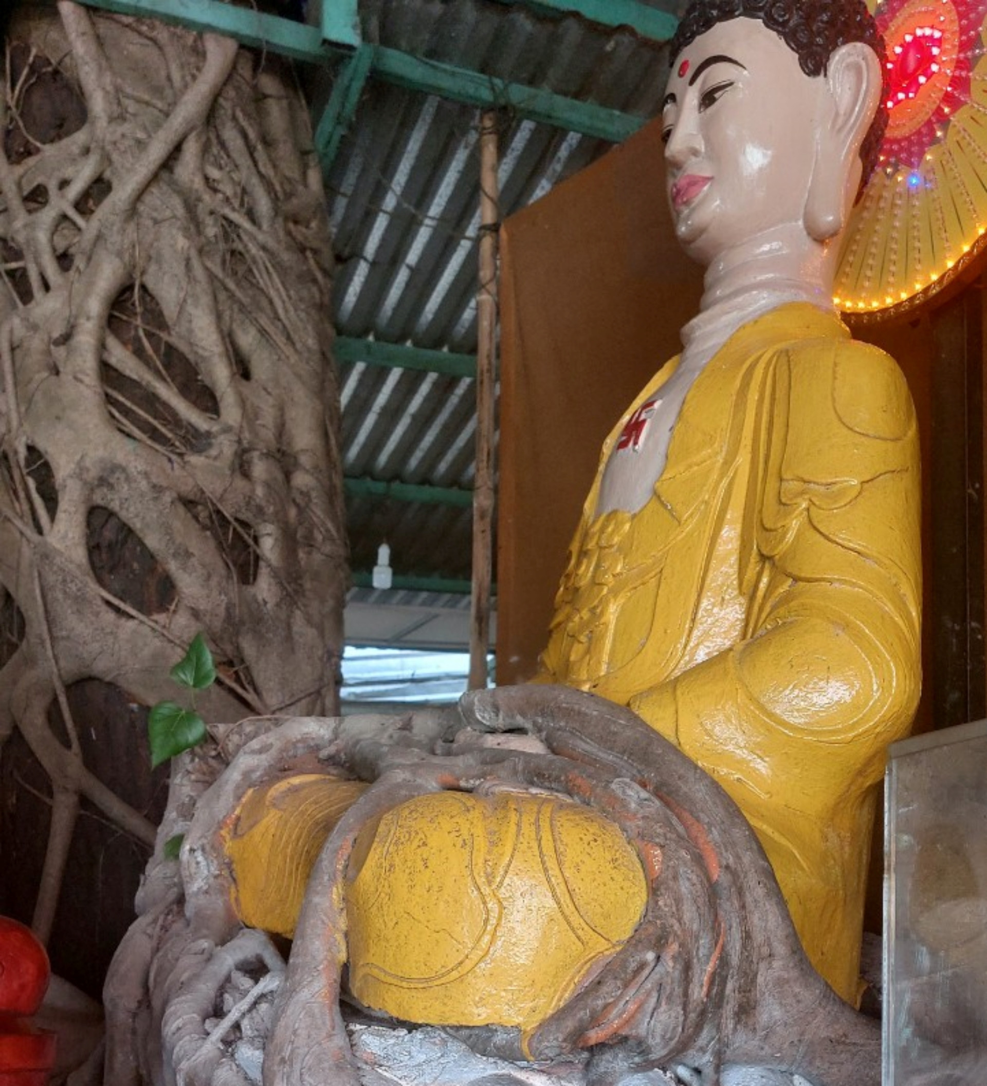 Qua năm tháng, cây bồ đề mọc lên cao, nâng theo bệ gạch đặt tượng Phật phía trên. Rễ cây bồ đề bám vít quanh tượng, tạo thành những mối dây vững chãi, giữ chặt bảo vệ tượng Phật.