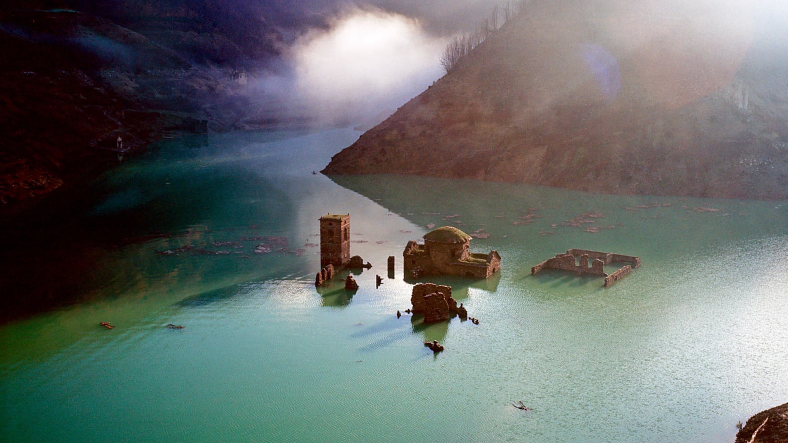 Ngôi làng cổ xuất hiện giữa hồ nước nhân tạo. Ảnh: Getty