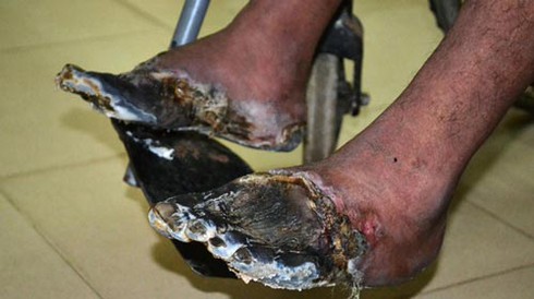 Cuối năm 2014, các móng chân phải của ông T. cứ rụng dần, đồng thời xuất hiện các vết đen ở chân khiến việc đi lại khó khăn hơn. Gia đình đưa ông vào Bệnh viện Nhân Dân 115 điều trị trong tình trạng toàn bộ bàn chân phải bị tím đen. Sau khi siêu âm, các bác sĩ cho biết bàn chân phải ông T. bị viêm do thuyên tắc mạch máu, dẫn đến hoại tử buộc phải phẫu thuật cắt bỏ.
