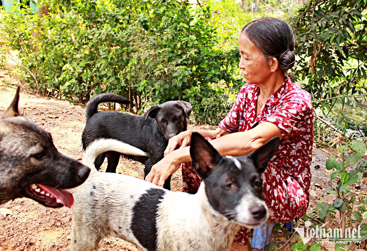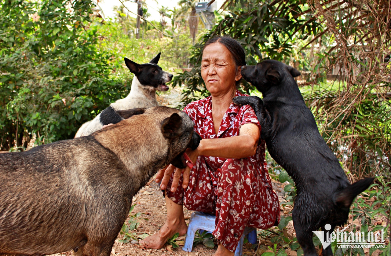 Dưới bóng mát của hàng dừa nước, bà đùa vui cùng đàn chó. Chúng quấn quýt dưới chân, dụi đầu vào người bà. Chốc chốc lại có chú cún tinh nghịch, nhảy chồm lên người khiến bà giật mình, phải ra lời mắng yêu.