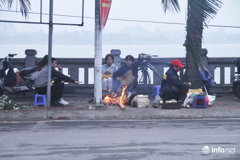 Tại những điểm bán hàng ngô, khoai nướng - một số người bán hàng đã nhóm những bếp củi để sưởi ấm cho thực khách. Hơi ấm của những lò nướng ngoài trời này tạo nên dư vị thân quen và gợi lại những kí ức tuổi thơ nơi quê nhà của nhiều người. |