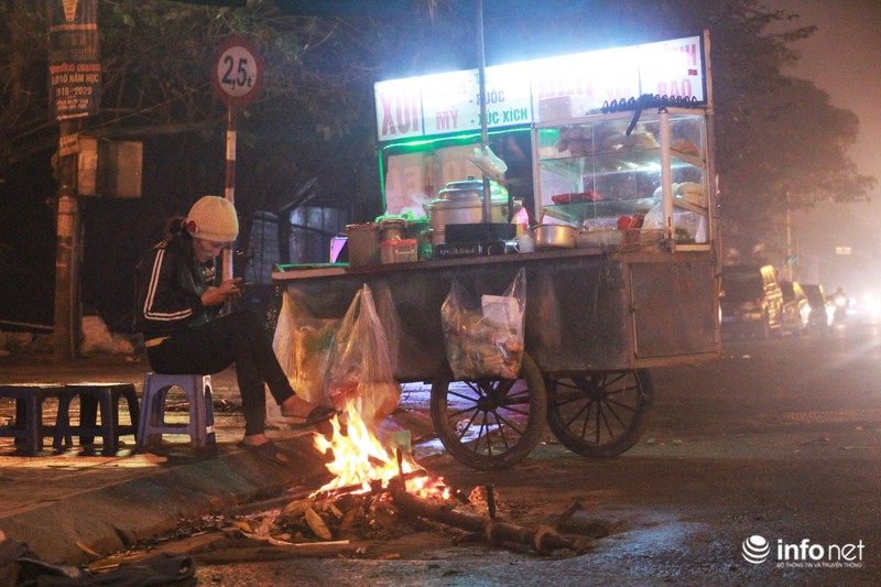 Một xe bán xôi đêm với đống lửa cháy bên cạnh, giúp xua bớt đi phần nào giá rét. |