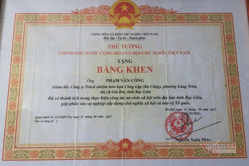 Bằng khen của Thủ tướng dành tặng ông Công. |