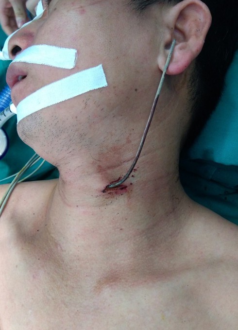 Người nhà anh T cho biết khi, anh đang đang ngồi sửa xe máy ở trước cửa nhà thì có một chiếc xe oto tải đi qua. Chiếc xe bất ngờ nổ lốp tạo áp lực khiến que sắt que đang nằm trên đường bắn vào cổ anh T.